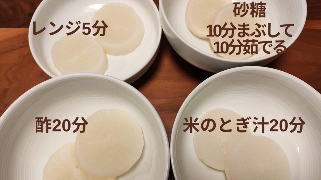 なかでも、米の研ぎ汁で茹でた大根は、他の方法に比べて苦味やえぐみが出にくく、すっきりとした上品な味わいを感じました。